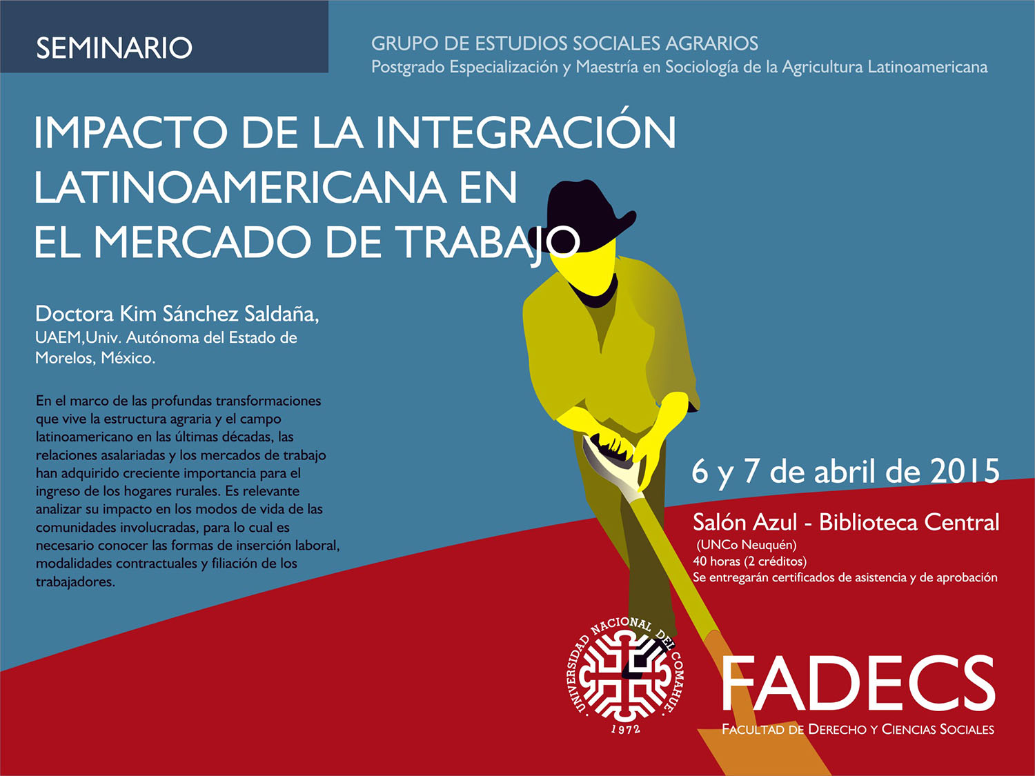 El Departamento de Postgrado de la Facultad de Derecho y Ciencias Sociales informó que se encuentran abiertas las inscripciones para el Seminario: "Historia nacional - Historia regional: aproximaciones explicativas al funcionamiento socio-económico y político del espacio patagónico", que se dictará en el marco de las carreras de Especialización y Maestría en Sociología de la Agricultura Latinoamericana. Se dictará el 11 y 12 de diciembre, de 10 a 18 h en el Salón Azul (Biblioteca Central de la UNCo) y estará a cargo de la profesora Susana Bandieri (ISHiR-CONICET y CEHIR-UNCo) Para mayor información, contactarse al e-mail: masal.unc@gmail.com