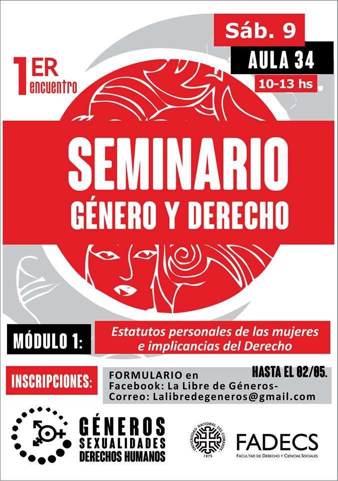 El último módulo del Seminario de Género y Derecho se enmarca en la Cátedra Libre de Géneros, Sexualidades y Derechos Humanos. El eje de este módulo será "Aborto". Para profundizar en la temática, la cátedra convocó a la comunidad en general, a la comunidad universitaria, a las organizaciones, instituciones públicas y a la prensa a participar y aportar en la difusión de esta actividad que contará con la presencia de Agustina Ramón Michel, abogada UNT y La Revuelta Colectiva Feminista / Socorristas en RED. El Módulo se dictará el sábado 12 de diciembre a las 9 h en el aula Auditorio de la Facultad de Derecho y Ciencias Sociales en General Roca. La actividad es abierta y gratuita. Los contenidos serán: Aborto. Aborto No Punible en nuestra Legislación. Fallo FAL. Protocolos de Actuación en las provincias. Objeción de Conciencia. Uso de Misoprostol. La abogada Ramón Michel hará una presentación de la situación actual, el marco legal, la vigencia de los protocolos de actuación, y el fallo FAL. La disertante es investigadora adjunta del Centro de Estudios de Estado y Sociedad (CEDES), donde desarrolla investigación aplicada en Derechos reproductivos, y es docente (UP). Más información en: Cátedra Libre de Géneros, Sexualidades y Derechos Humanos página oficial |
