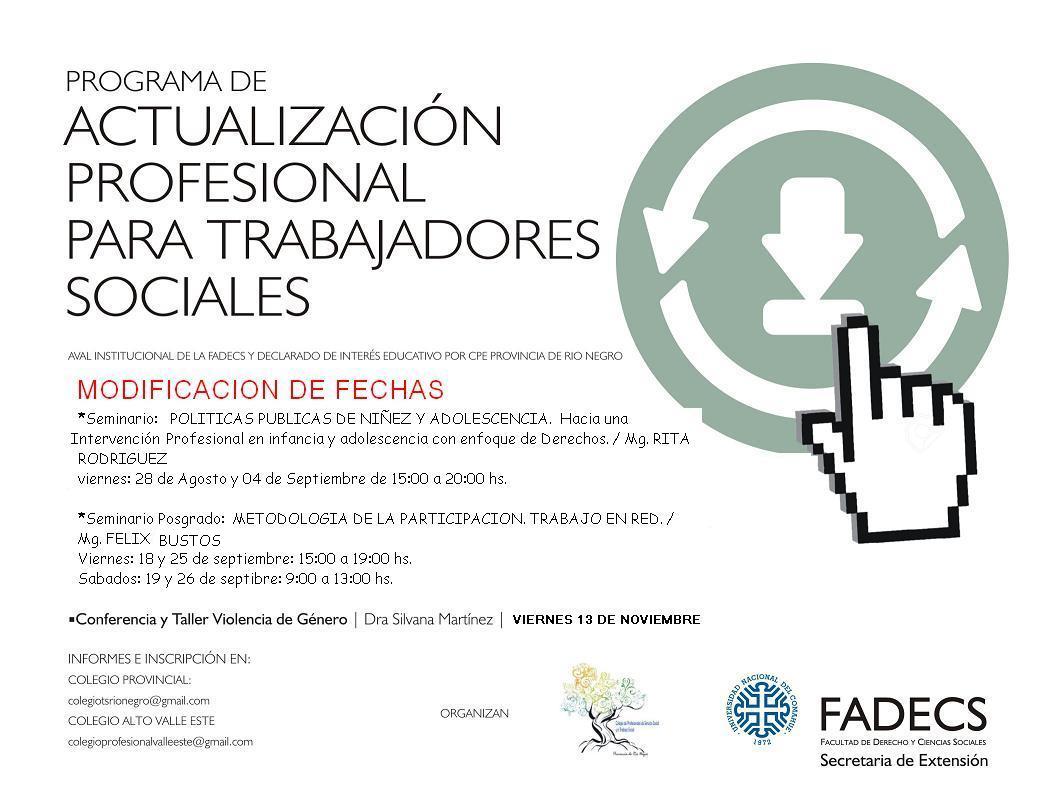 El personal del Departamento de Postgrado de la FADECS UNCo se encuentra en receso, implementado mediante la Resolución Rectoral Nº 1075 , durante el período comprendido entre los días del 4 de Enero y hasta el 30 de Enero de 2016, ambas fechas inclusive. En tal sentido, se solicitó a los interesados en contactarse, hacerlo luego de esa fecha y su consulta será atendida. (Comunicado emitido por el Equipo Departamento de Postgrado de la FADECS-UNCo)