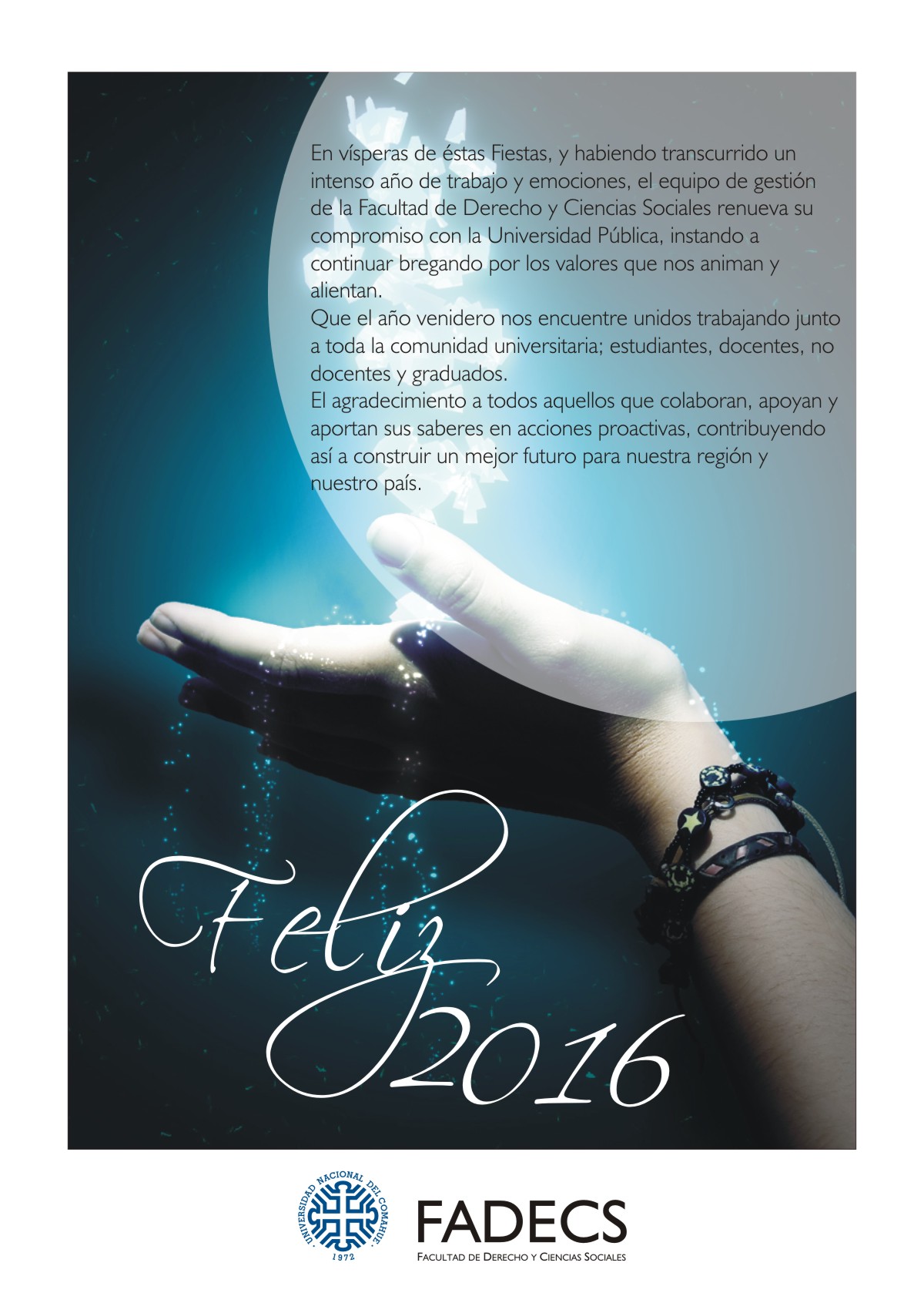 En vísperas de éstas Fiestas, y habiendo transcurrido un intenso año de trabajo y emociones, el equipo de gestión de la Facultad de Derecho y Ciencias Sociales renueva su compromiso con la Universidad Pública, instando a continuar bregando por los valores que nos animan y alientan. Que el año venidero nos encuentre unidos trabajando junto a toda la comunidad universitaria; estudiantes, docentes, no docentes y graduados. El agradecimiento a todos aquellos que colaboran, apoyan y aportan sus saberes en acciones proactivas, contribuyendo así a construir un mejor futuro para nuestra región y nuestro país.