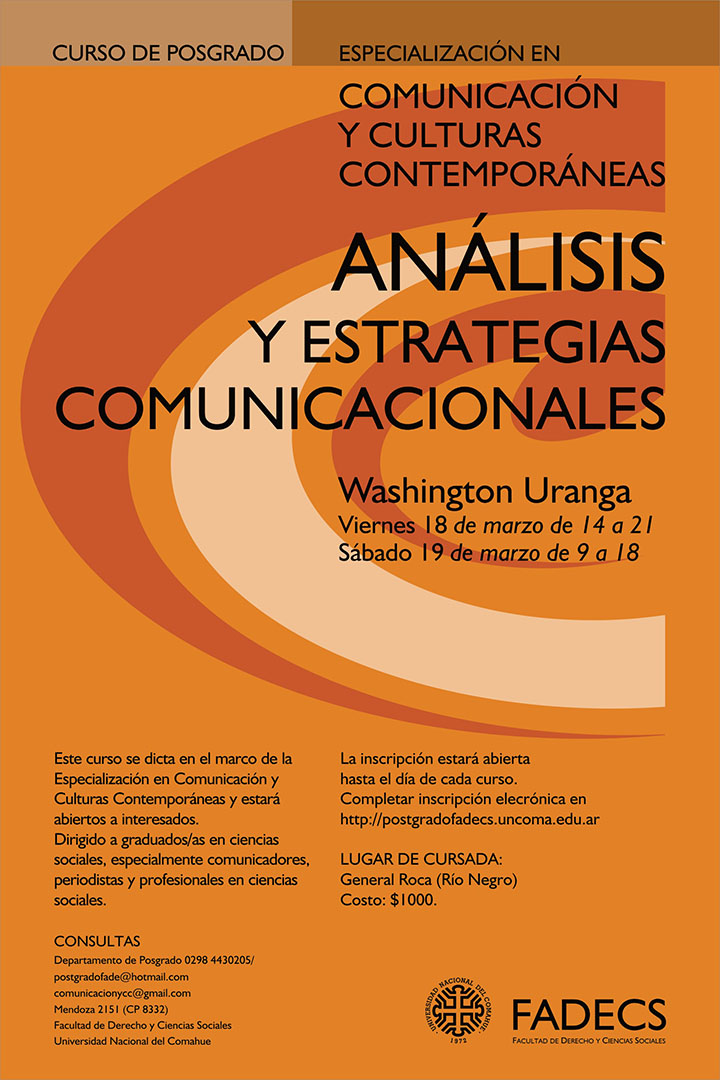 La Especialización en Comunicación y Culturas Contemporáneas obtuvo el reconocimiento oficial como carrera de Postgrado de la FADECS UNCo. En dictamen realizado el 7 de noviembre de 2016, la Comisión Nacional de Evaluación y Acreditación Universitaria consideró que “la carrera cumple con las normas de calidad establecidas en las resoluciones ministeriales número 160/11 y 2385/15 con respecto a inserción y marco institucional, cuerpo académico, evaluación final e infraestructura y equipamiento”. Esta especialización es la primera específica en el campo de la comunicación y el periodismo que se dicta en la Facultad de Derecho y Ciencias Sociales de la UNCo. Está dirigida por el Dr. Alejandro Rost y los integrantes del Comité Académico son Pablo Schleifer, María Teresa Bernardi, Marcelo Loaiza, Fabián Bergero, Valeria Belmonte y Bettina Pinto Aparicio. La carrera cuenta con docentes designados de distintas universidades de la Argentina y también del exterior como el Mg. Luis Sandoval, la Dra. Vanina Papalini, la Dra. Natalia Raimondo Anselmino, la Dra. Bárbara Yuste, el Lic. Álvaro Liuzzi, la Dra. María Graciela Rodríguez, el Esp. Juan Mascardi, el Dr. Washington Uranga. Además participan docentes locales como el Dr. Ricardo Haye, la Mg. Lucrecia Reta, la Prof. Roxana Muñoz, la Prof. Laura Marcoccia y los integrantes del Comité Académico. |