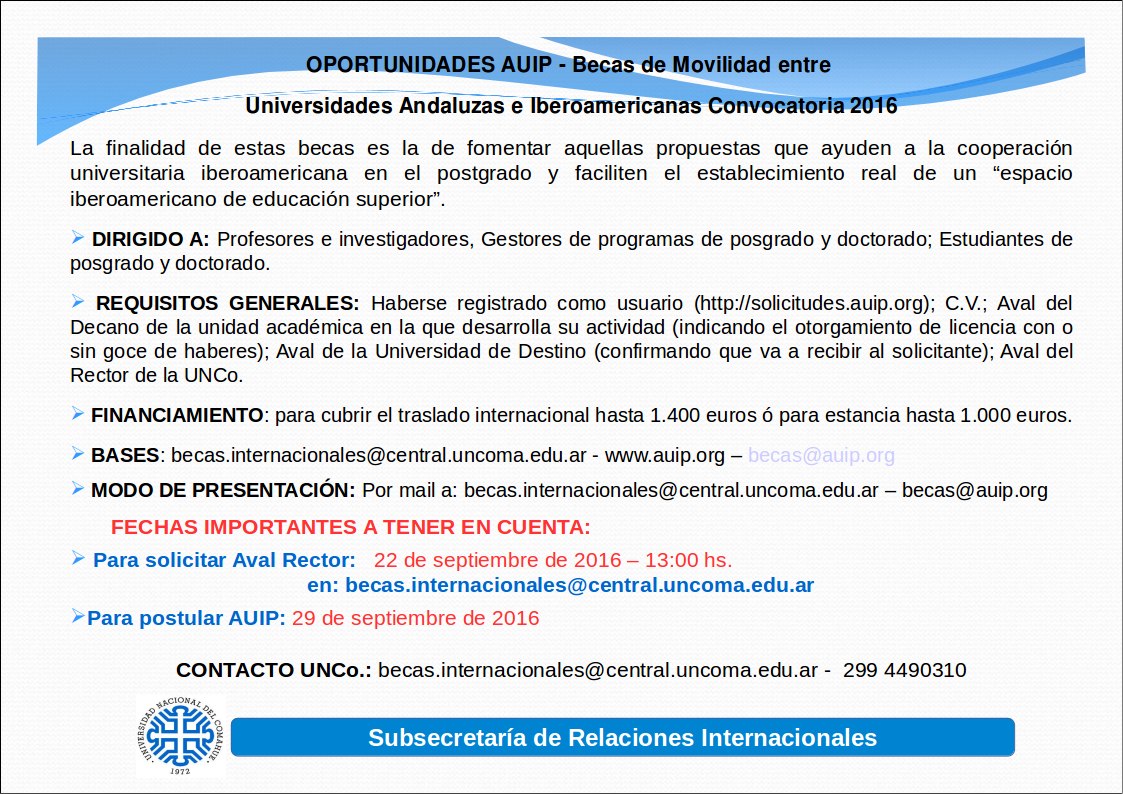 Beca Emerging Leaders in the Americas Program (ELAP)-Canadá Las becas Líderes Emergentes de las Américas (ELAP) proporcionan a los estudiantes de pregrado y posgrado de América Latina y el Caribe con la oportunidad de realizar un intercambio estudiantil (semestre) en una universidad canadiense. Para poder aplicar, la universidad requiere tener un convenio con un par canadiense. La UNCo tiene convenio con la Universidad de Québec y con The Northern Alberta Institute of Technology (Facultad de Turismo). Fecha límite: 29 de abril 2016 |