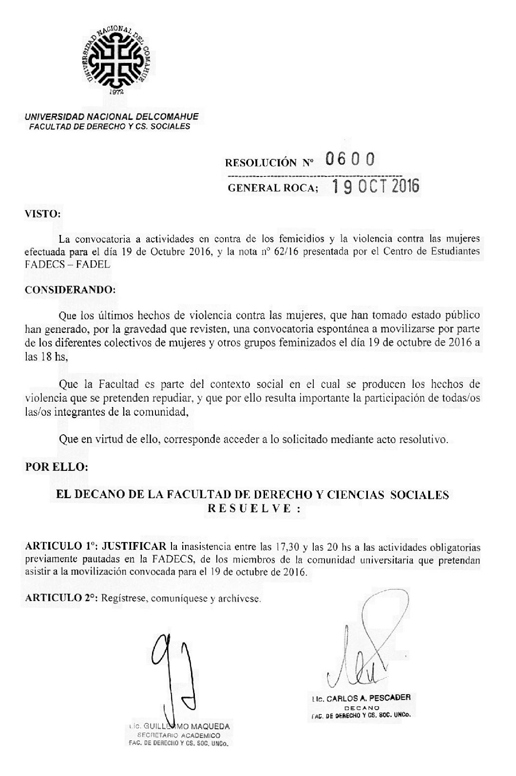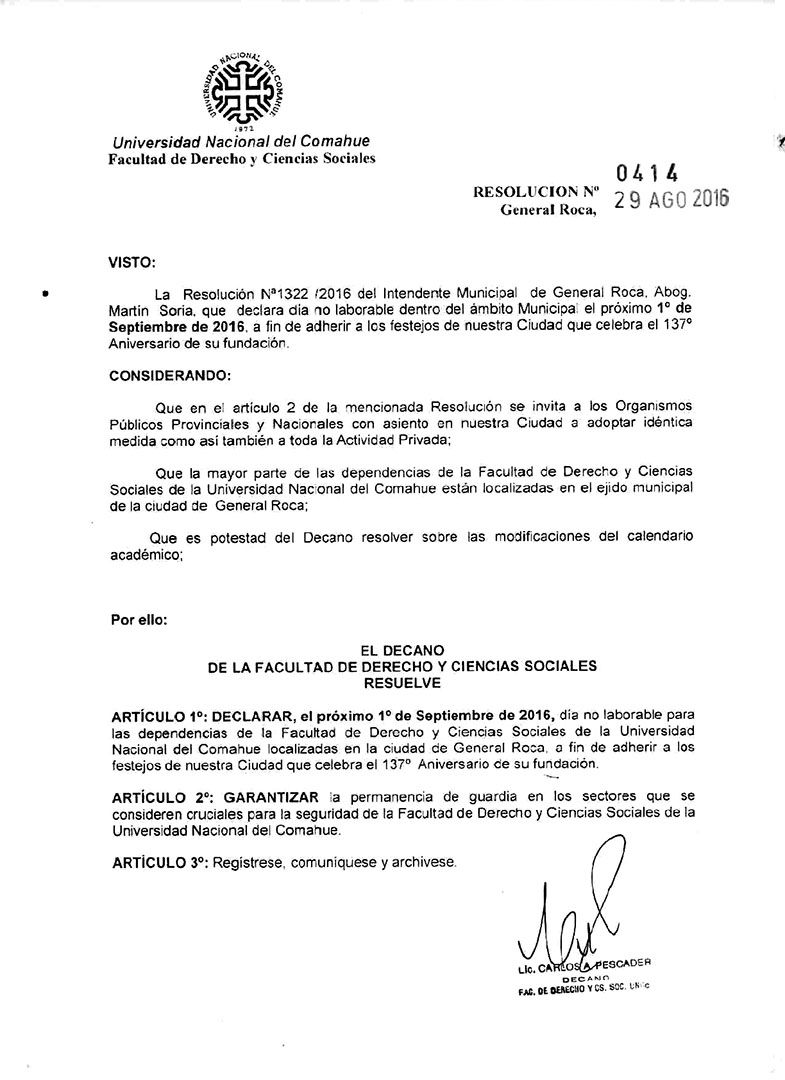 "Que mediante la Resolución Rectoral N° 1088/2016 se estableció el receso funcional de actividades en la UNComa, extensivo a todas las Facultades, Centros Regionales, Asentamientos, Escuela y dependencias de la Administración Central, durante el período comprendido entre los días del 9 de enero y hasta el 31 de enero de 2017, ambas fechas inclusive. Que las actividades Académicas de la FADECS ya han culminado. Que, como es habitual por la época del año, las actividades administrativas han mermado su intensidad, excepto en áreas específicas. Que el Rectorado ha dispuesto que el receso comience la segunda semana de enero de 2017, y que conforme se ha informado, con anterioridad a tal acto, parte importante del personal de la FADECS ha planificado diversas actividades que implican trasladarse durante la primera semana de enero, atento la habitualidad del inicio del receso el primer día hábil de enero. Que en virtud de ello, corresponde proceder mediante acto resolutivo. El Decano de la FACULTAD DE DERECHO Y CIENCIAS SOCIALES resuelve: OTORGAR asueto académico y administrativo desde el día 02 de enero de 2017 y hasta el día 06 de enero de 2017, ambas fechas inclusive." Se adjunta Resolución N° 0701 del 26 de diciembre de 2016. |