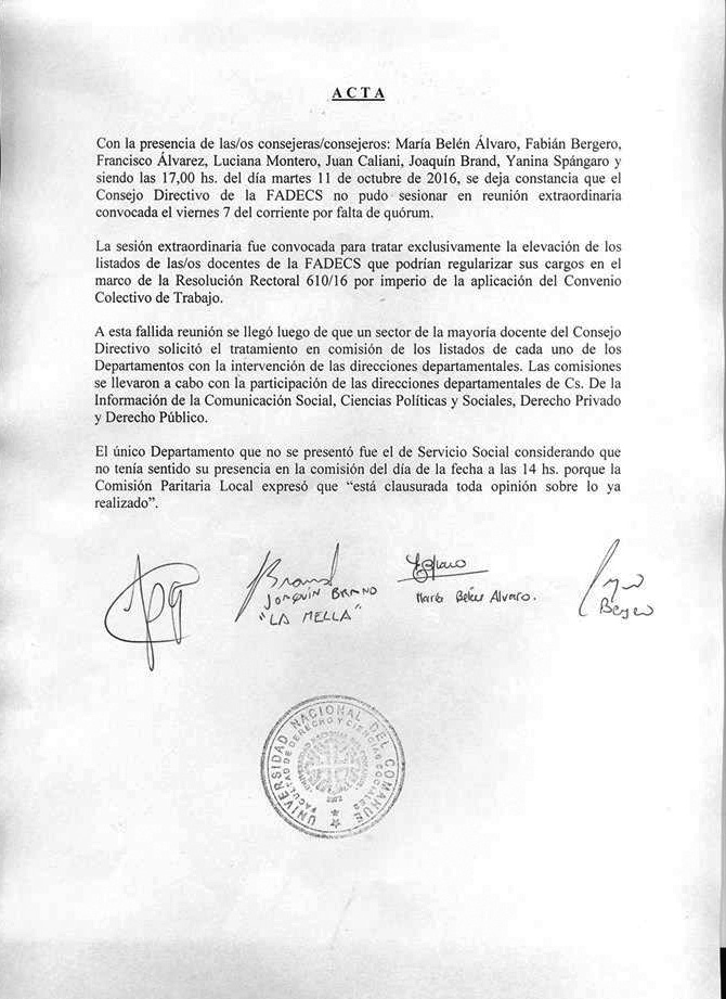 El lunes 15 de febrero está prevista una nueva reunión entre las partes planteadas para lograr un acercamiento y resolución. Creemos necesario que la comunidad conozca la situación para que pueda dimensionar los fundamentos en juego en éste conflicto y comprenda la complejidad de la misma. Está prevista la reprogramación de las mesas de examen, la renovación de becas y residencia y demás trámites con fechas previstas, para lo cual estamos trabajando activamente. Las actividades que están vinculadas con otros espacios afuera del edificio ( proyectos de extensión, pasantías) se continúan manteniendo, y respondiendo a todas las consultas de estudiantes y personas interesadas en ingresar a la Facultad de Derecho y Ciencias Sociales a través de facebook y a los correos institucionales. Los mantendremos informados. A tal efecto reiteramos los que puedan ser de interés Información sobre inscripciones: |