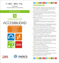 La XII Jornada de Accesibilidad "Construyendo espacios plenamente accesibles", se realizará el miércoles 7 de diciembre de 9 a 13 h, en el aula Auditorio de la Facultad de Derecho y Ciencias Sociales. El Grupo INCA está formado por estudiantes con discapacidades que cursan carreras universitarias en la FADECS. Detrás del objetivo de hacer visibles al grupo específico, se planificó un trabajo mancomunado entre docentes, no docentes y estudiantes. De esta manera se pudo crear y sostener la Biblioteca Sonora, implementar cartelera Braille y señalética de bancos y estacionamiento para vehículos, dictar cursos de Señas Argentina, y de Informática para ciegos, entre otras acciones. Desde su conformación, hace dieciséis años, el trabajo del Grupo INCA se ha exhibido en diferentes encuentros nacionales y ha permitido un vínculo muy cercano y estrecho con otras universidades nacionales. En la FADECS la inclusión de las personas con discapacidad se realiza sin discriminación. Se adjunta programa |