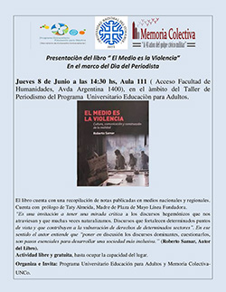 Dos cursos de posgrado en comunicación se realizarán en la Facultad de Derecho y Ciencias Sociales en los próximos días, en el marco de la Especialización en Comunicación y Culturas Contemporáneas. El primero es sobre “Historia de las ideas y las estrategias de comunicación popular en América Latina” y lo dictará el Mg Daniel Badenes el viernes 24 y sábado 25 de febrero de 2017. Se trata de un curso optativo de la Especialización, que está abierto a inscripción de graduados/as que no están realizando la carrera. Badenes es profesor de grado y posgrado, investigador y extensionista de las universidades nacionales de La Plata y Quilmes. En la UNLP es Profesor Titular Ordinario de Historia Social de los Medios y coordina el Taller de Tesis de la Maestría en Historia y Memoria. En la UNQ está a cargo de los cursos Historia de los Medios de Comunicación (para las carreras de Comunicación, Historia y Gestión de Medios Comunitarios), dirige el proyecto de investigación “Edición independiente y tecnologías digitales” y el proyecto de extensión “El sur también publica. Promoción y circulación de la edición independiente y autogestiva de libros y revistas”. Además es profesor en la Maestría en Ciencias Sociales y Humanidades. Fue director de la Licenciatura en Comunicación Social de la UNQ (2012-2016) y presidente de la Red de Carreras de Comunicación Social y Periodismo de Argentina- REDCOM (2013-2016), cuya revista académica dirige. Ejerce el periodismo hace más de quince años. Es editor de la revista La Pulseada, coordinador editorial de Fronteras y periodista de la radio comunitaria Futura. Es autor de Historia de los medios de comunicación (UVQ, 2014) y Un pasado para La Plata (EME, 2015); coautor de La muestra ambulante (La Grieta, 2009) y Lápices (Ediciones del Liceo, UNLP, 2010); compilador de Historia, memoria y comunicación (UNQ, 2011); editor de 2A. El naufragio de La Plata (La Pulseada, 2014) y participó de libros colectivos como La Plata, ciudad inventada (Primer Párrafo, 2010), La voz de los lonkos (Editorial Catalonia, Chile, 2013), La Plata Spoon River (La Tarita Dorada, 2014) y Agua en la cabeza (Club Hem-Pixel, 2014), Democracia y sociedad en la Argentina contemporánea (UNQ, 2015), Voces abiertas: comunicación, política y ciudadanía en América Latina (CLACSO, 2015), Derechos Humanos y Comunicación. Una lectura crítica emancipatoria (CIESPAL, 2016) entre otros. El segundo curso lo va a dar la Dra María Graciela Rodríguez sobre “Estudios Críticos de la Cultura”. Es un seminario que se va a realizar el viernes 10 y sábado 11 de marzo. Rodríguez es Doctora en Ciencias Sociales, por la Universidad de Buenos Aires; Magister en Sociología de la Cultura, por la Universidad Nacional de San Martín; Licenciada en Ciencias de la Comunicación por la Universidad de Buenos Aires. Investigadora categoría II. Directora del proyecto “Formas contemporáneas de legitimación de la desigualdad.Imágenes de la subalternidad en los medios de comunicación”. Profesora Adjunta Regular del Seminario de “Cultura Popular y Cultura Masiva” en la UBA y Profesora Asociada Regular de "Sociedad, Cultura y Poder" en la Universidad Nacional de San Martín. Se puede consultar su CV en el sitio web de la UNSam: http://unsam.academia.edu/MariaGracielaRodriguez/CurriculumVitae Ambos cursos forman parte de la orientación Políticas y Estrategias de la Comunicación de la Especialización en Comunicación y Culturas Contemporáneas pero está también abierto a graduados/as de otras carreras. Está dirigido a egresados/as en ciencias sociales y humanas, especialmente a profesionales de medios de comunicación, periodistas, comunicadores, y vinculados a las ciencias sociales. Para público en general, el costo por curso será de 1000 pesos. Son gratuitos para docentes de la FADECS y becarios/as de la Universidad Nacional del Comahue, de acuerdo a la Resolución 300 del Consejo Directivo de octubre de 2014. La inscripción estará abierta hasta el día de cada curso. Inscripción electrónica: http://goo.gl/forms/ONv0UmWltb Presentar fotocopia de DNI y de título el día de inicio de cada curso. Consultas: en Departamento de Posgrado 0298 4430205 // postgradofade@hotmail.com // comunicacionycc@gmail.com Más información: