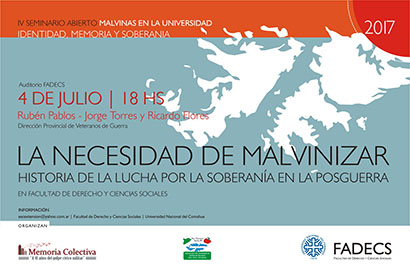 La Secretaría de Extensión de la Facultad de Derecho y Ciencias Sociales informa las consignas a tener en cuenta para la presentación del trabajo práctico del IV Seminario "Malvinas en la Universidad Identidad, memoria y soberanía" 2017. Para poder completar el Seminario y obtener el certificado de aprobación de acuerdo al reglamento, deberán presentar el trabajo final aquellos que hayan participado de al menos 4 de los 5 módulos realizados según la programación. Las pautas de presentación son las siguientes: 1. Elegir un tema de los módulos que se abordaron en el seminario de este año. 2. Realizar un trabajo de análisis y reflexión, en el que también se plantee la forma en la cual los ciudadanos argentinos podamos contribuir a recuperar nuestro territorio. 3. El trabajo debe ser individual. 4. Presentar el texto impreso (no mas de 14 carillas), respetando las siguientes indicaciones hoja A4; letra Arial 12; interlineado 1,5; márgenes: izquierdo: 3 cm., derecho: 2 cm., superior: 3,5 cm. , inferior: 2,5 cm. 5. Deberá constar nombre y apellido y número de DNI del autor. 7. Se deberá entregar en la Secretaria de Extensión de la FADECS, de lunes a viernes, de 8 a 14 horas. Las consultas deben realizarse a Ricardo Flores, correo malvinasrocarionegro@gmail.com, celular 298 4407203. |