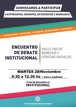 La Secretaría de Extensión de la Facultad de Derecho y Ciencias Sociales invita al Encuentro de Debate Institucional a realizarse el martes 28 de noviembre de 9:30 a 12:30 en aula a 35. El Encuentro de Debate Institucional es la instancia colectiva de participación de la Unidad Académica en el Plan de Desarrollo Institucional de la Universidad. A la jornada están invitados a participar estudiantes, graduados, docentes, personal no docente y autoridades de cada una de las Unidades Académicas. La participación es abierta y voluntaria. El objetivo principal es reflexionar colectivamente sobre las inquietudes de cada Unidad Académica, analizando y debatiendo prioridades institucionales. A su vez, en cada jornada se presentan resultados arrojados por las encuestas, que sirven de disparadores para el análisis y la reflexión. El Encuentro tiene una duración máxima de 3 horas y está coordinada por la Secretaría de Planeamiento y Desarrollo Institucional que, mediante técnicas y actividades, guía y acompaña los debates y la elaboración de conclusiones. Por consultas, dudas o comentarios: secretaria.planeamiento@central.uncoma.edu.ar 0299 449-0300 int. 717 y 718 |