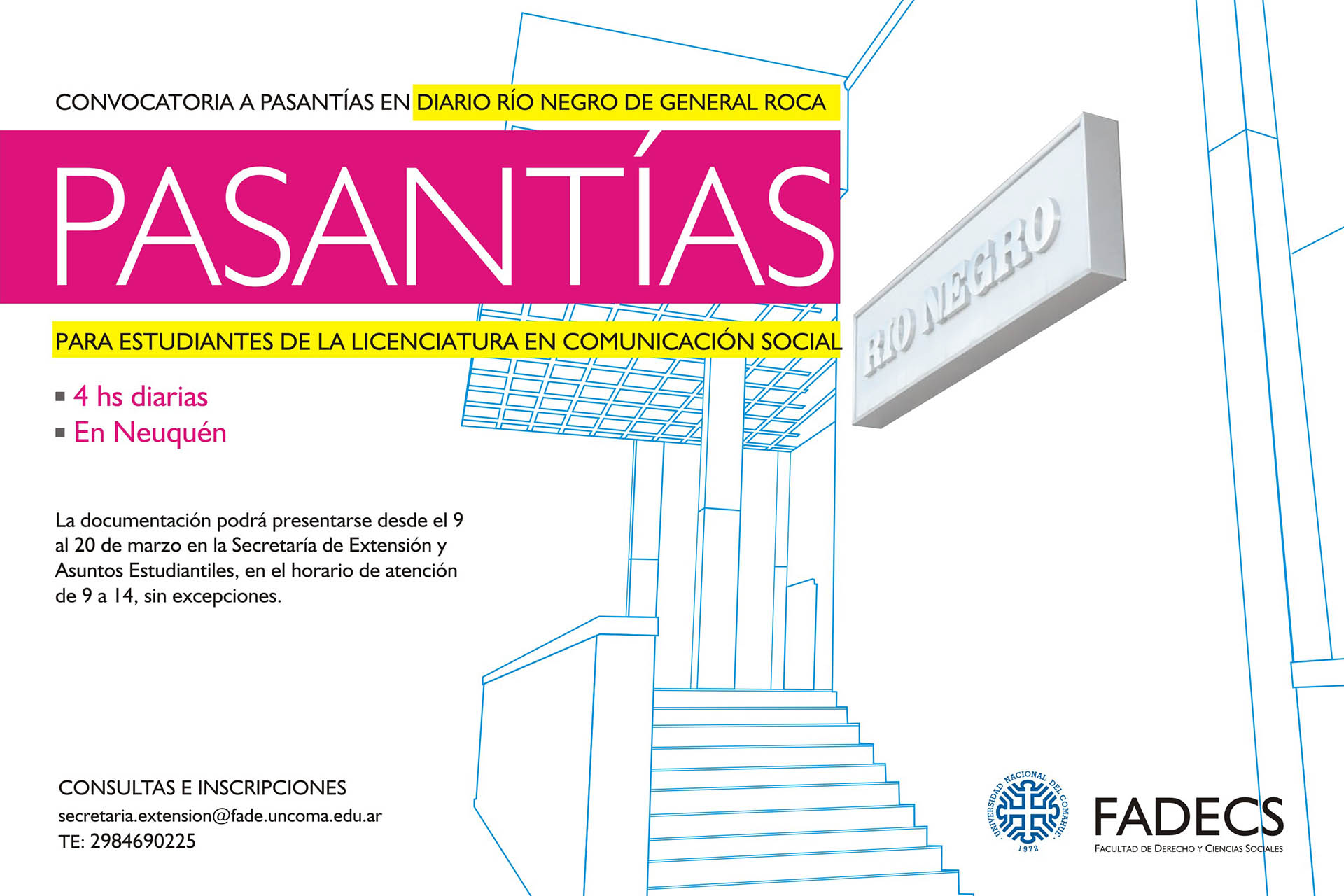 Por consultas, comunicarse al 0298-4435700, alumnos@fade.uncoma.edu.ar o bien a orientacion@fade.uncoma.edu.ar