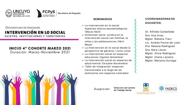 La Diplomatura de Posgrado Intervención en lo social: sujetos, instituciones y territorio invita a profesionales que se desempeñan en el campo de lo social a los seminarios que integran el cuarto cohorte de la Diplomatura que se inicia en marzo de 2021.