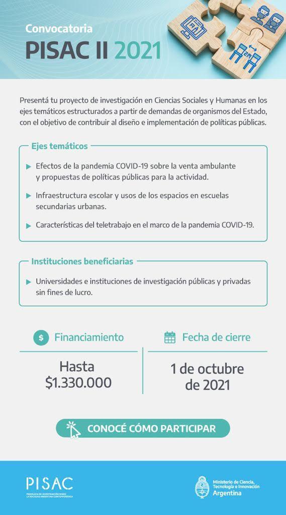 La Agencia Nacional de Promoción de la Investigación, el Desarrollo Tecnológico y la Innovación informa que el segundo seminario de la convocatoria PISAC COVID-19 será el viernes 30 de julio a las 10. El evento tendrá una duración de dos horas y estarán invitadas distintas autoridades.